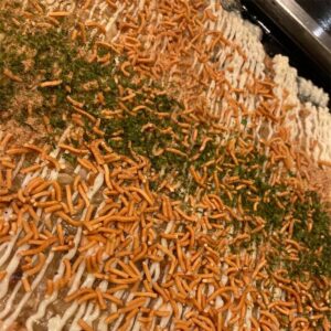 常連さんリピート率NO.1の、ひろが誇る人気もんじゃ! 口の中ではじけるプリプリのシャケに合わせるようにベビースターは後乗せカリカリで!